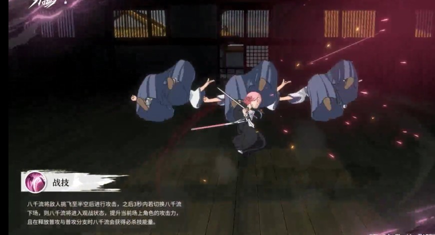 草鹿八千流释放战技后,会先把目标挑空,紧接着追加一次强力斩击。该技能的关键作用并非只是单纯进行输出,重点在于触发其后台增益机制。建议在技能释放后的3秒内,快速将角色替换下场,一旦进入观战状态,就能为当下出战的队友提供攻击力增益。除此之外,当队友使用普攻或者分支攻击时,草鹿八千流还可以持续积攒必杀技能量,达成资源循环。