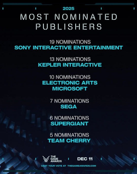 在发行商排名里,Kepler Interactive依靠《光与影:33号远征队》所获得的13项提名位居第二,这部作品还打破了TGA历史上单款游戏提名数量的纪录,EA和微软则各自凭借10项提名共同排在第三位。