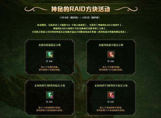 还有“神秘的RAID方块活动”,英雄们在活动期间完成指定战役,就能获取“神秘的RAID方块碎片”,这些碎片可在兑换商店兑换各类“方块”;把不同的方块放进对应的材料道具里,会复制出不同数量的奖励道具并返还给玩家。