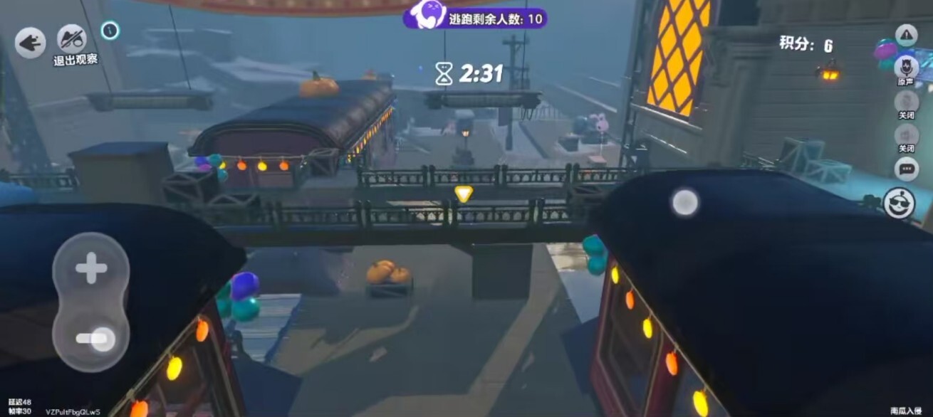 火车车尾的告示牌也能用来躲藏,操作很简单,只要掌握好跳坡技巧就能轻松上去。站在告示牌上,既能躲避下方南瓜的搜索,还能随时观察周围情况。发现危险后可以迅速跳下转移阵地,对喜欢躲藏的玩家来说比较轻松。不过要注意,告示牌背后的墙是假的,千万别贸然尝试。餐厅旁边有个大灯的点位,很适合隐藏。跳上餐桌后点击跳跃键,就能跳到小型木板上。