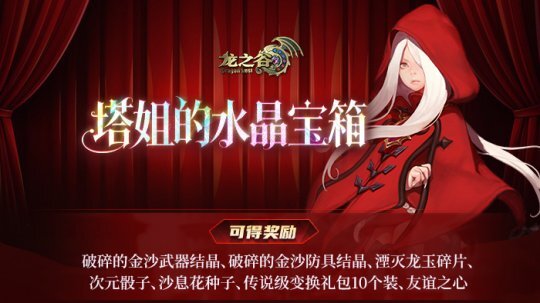 “塔姐的水晶宝箱”同步开启。冒险家在游戏里完成指定任务就能收集幸运水晶,用来提升“水晶宝箱”等级。宝箱共有七级,等级越高,可领取的【次元之核职业选择袋子】、【友谊之心(不可交易)】、【充满魔力的变换碎片】等丰厚奖励就越多!