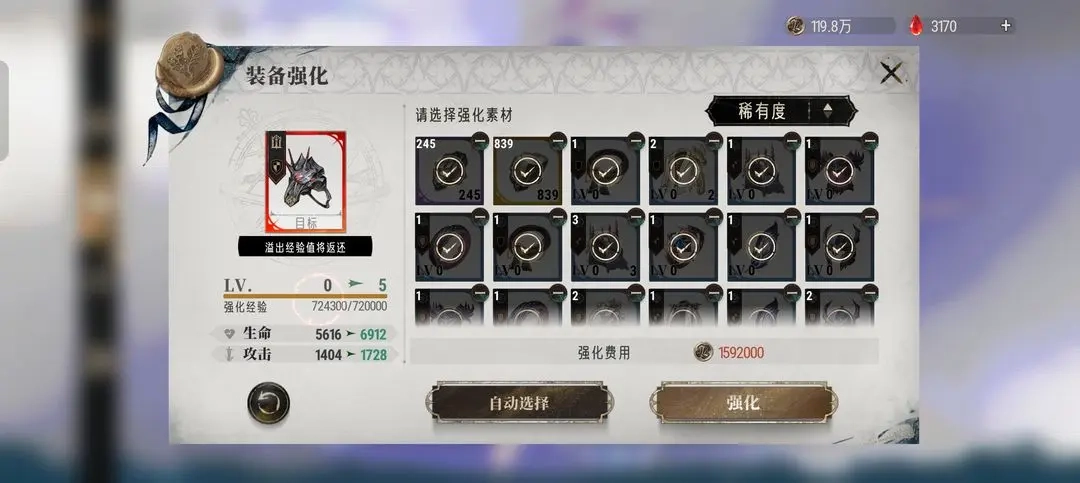 注意:装备仅需升级到八级,点两级就能基本通过15-8关卡(低于八级的装备无需升级)