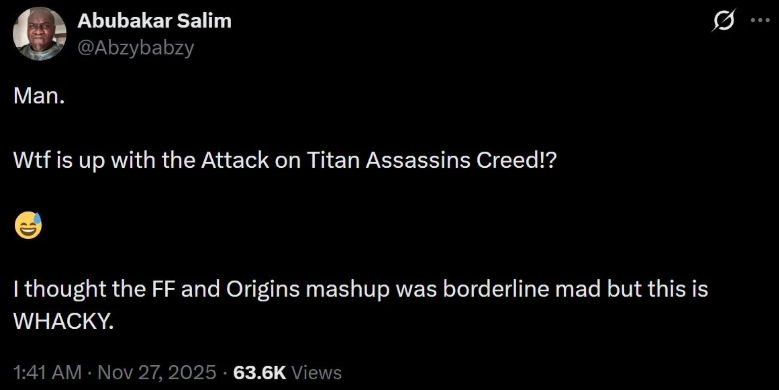 他在社交平台发文说:“《刺客信条》和《进击的巨人》这是在搞什么名堂?我之前觉得《刺客信条:起源》跟《最终幻想》的联动已经够离谱了,可这次真的是胡闹到家了。”