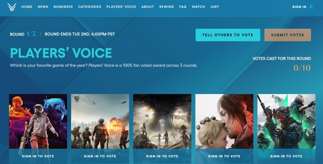 2025年TGA“玩家之声(Player's Voice)”奖项第一轮投票目前已正式启动,该奖项的评选完全依托粉丝投票,整个投票流程共分为三轮。