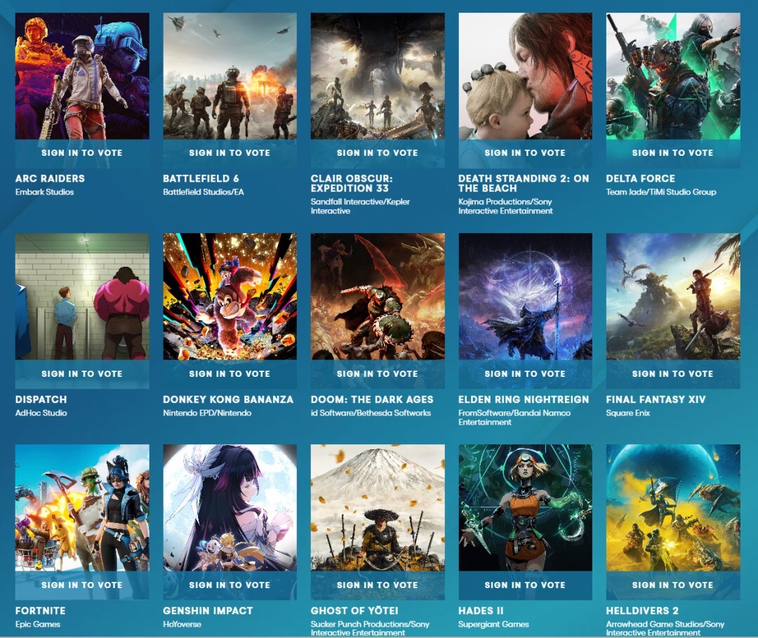 当前处于第一轮投票阶段,玩家可从30款获得提名的游戏里挑选10款,这30款入围游戏包括《战地6》《三角洲行动》《原神》《忍者龙剑传4》《光与影:33号远征队》《超英派遣中心》《艾尔登法环:黑夜君临》《最终幻想14》等。