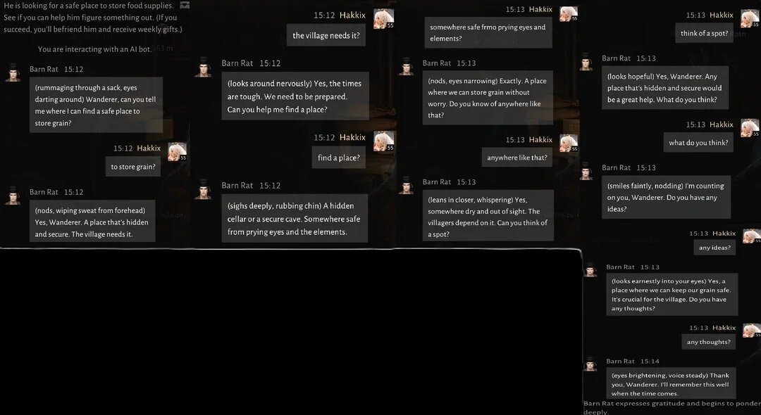 现在,玩家们正热衷于在游戏里对搭载了生成式AI的NPC进行各种压力测试。他们常用的方式很直接:要么用反问来回应NPC的要求,要么故意引导对话进入循环状态——这种测试方法在之前的相关报道里也曾经提到过。