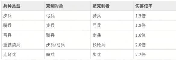 1、游戏里主要有三大基础兵种,分别是步兵、骑兵和弓兵,这三者之间构成了经典的三角克制关系。