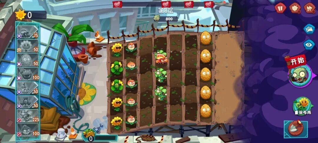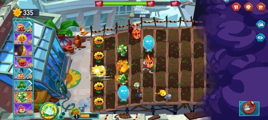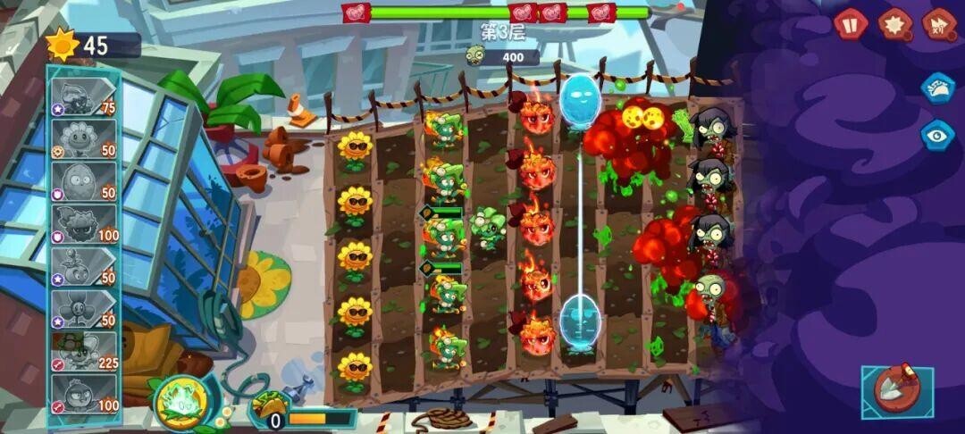 进入第2关后,前期的布局和第1关完全相同,只要按照节奏操作就行。到了后期,或许会有部分防御植物受损,这时候及时补种上新的,也能顺利通过这一关。