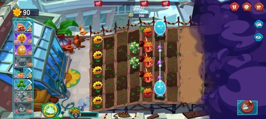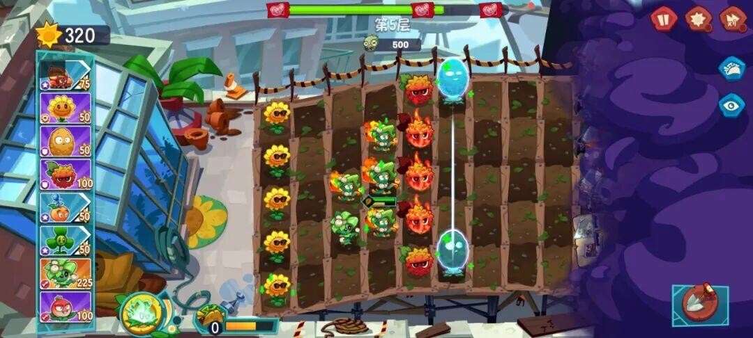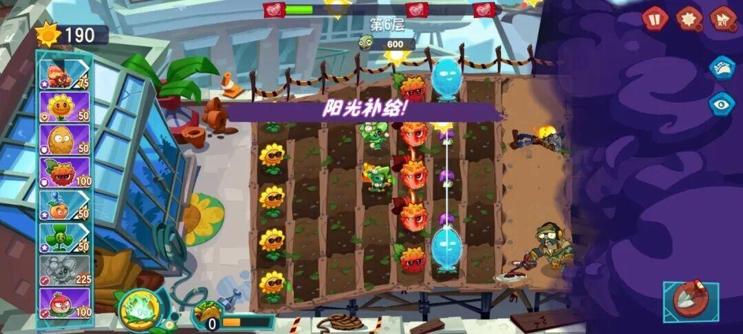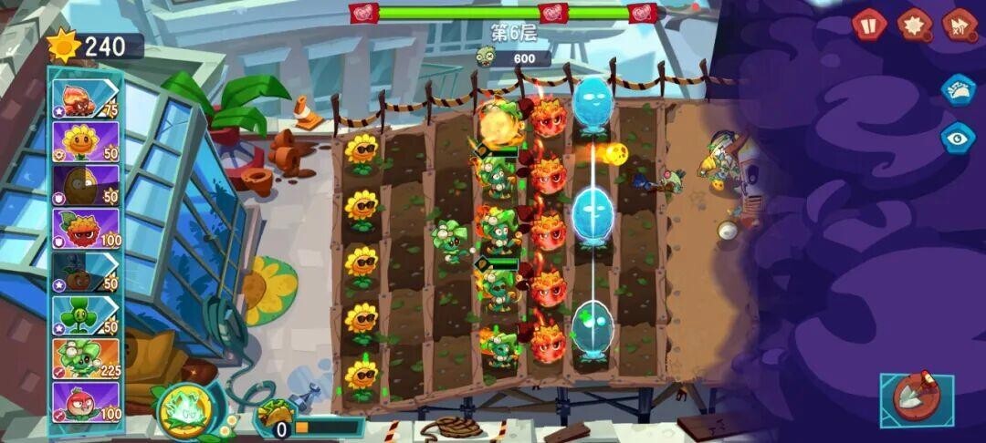 来到第6关,布局和上图一样,收集阳光,种满“榭寄生投手+岩浆玉露”的组合,合理运用玉米卷和闪电技能,也能顺利通关。