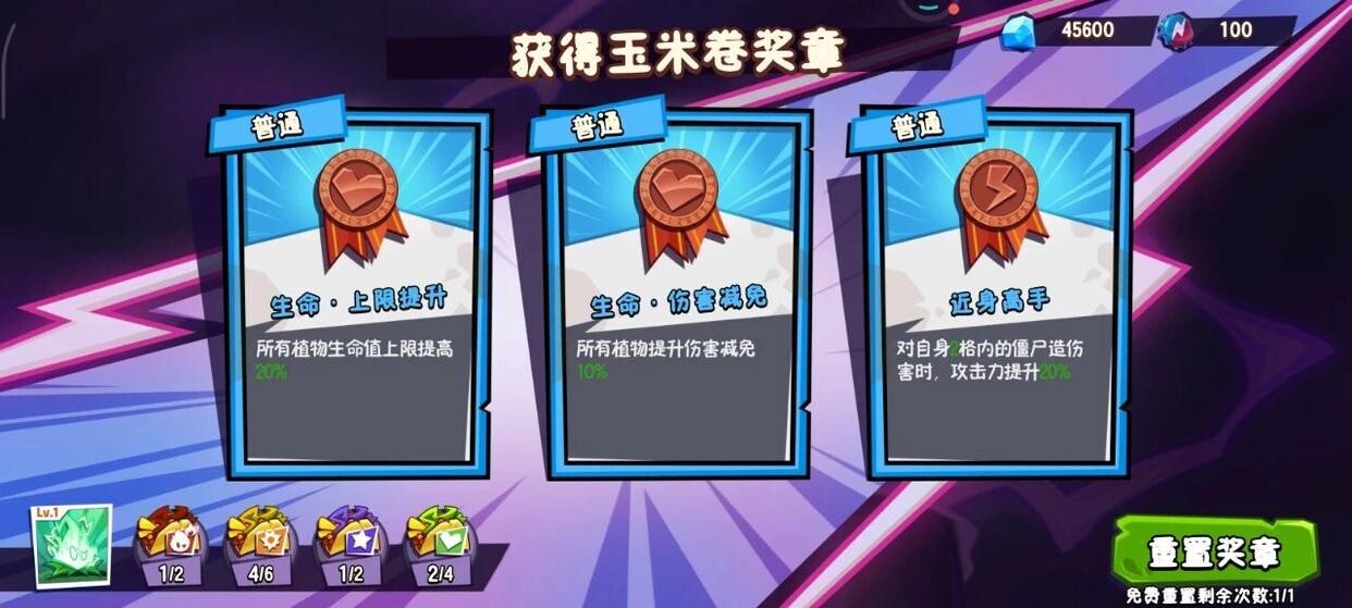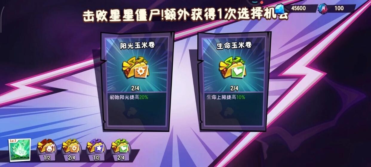 ps:当我们在关卡中击败星星僵尸后,会出现玉米卷和玉米卷奖章的加成选项供选择。建议优先挑选能增加阳光的加成,接着选择可以提升攻击力的,而伤害减免类的加成则可以放在后面考虑。