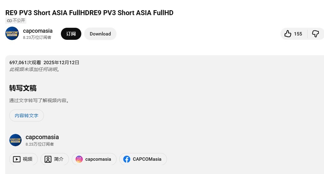 该视频由capcomasia账号发布,目前处于“不公开”状态,只能通过特定链接查看,尚未正式推出。
