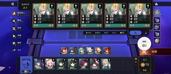选择二费角色,砂金要等升到三星再出售,其他角色升到二星就可以卖掉,前期还能顺便积累长线利好的触发次数,以此来获得一金币的刷新机会。