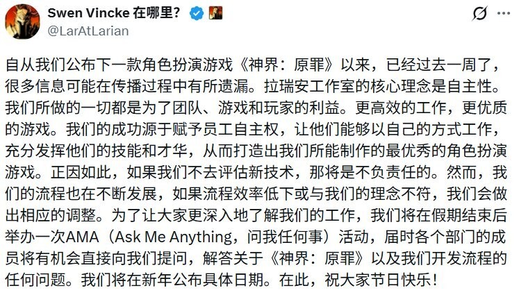 拉瑞安工作室CEO斯温·文克亲自发布回应声明。文克坦言《神界》公告里的部分内容存在误解,同时着重强调了工作室长期秉持的开发理念,再次申明玩家选择权与开发者自主权一直是拉瑞安的核心特质。他还提到,工作室正致力于建立灵活的工作流程,以便让开发者能创作出最优秀的角色扮演游戏。