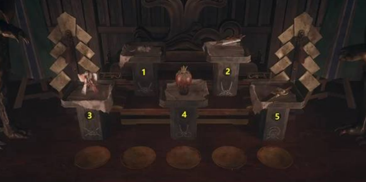 祭坛谜题的故事难度设置如下:每个物品上都系有草编绳结,只要选择绳结与底座图案相匹配的物品放置,就能触发对应的剧情。根据图中的编号提示,在1号位置放置老鼠,2号位置放置鱼,3号位置放置纸和服,4号位置放置小壶,5号位置放置扇子就可以了。