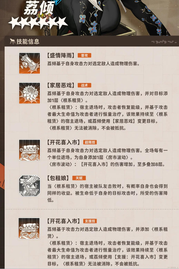 荔倾是队伍的输出与辅助核心,她的技能具备回能与治疗效果,能够提升队伍的持续作战能力。