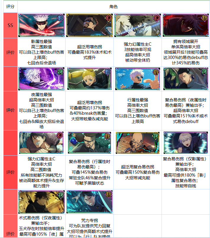 虎杖悠仁:其技能能够提高自身的暴击率与黑常率,在针对单个目标时具备十分强劲的输出能力。