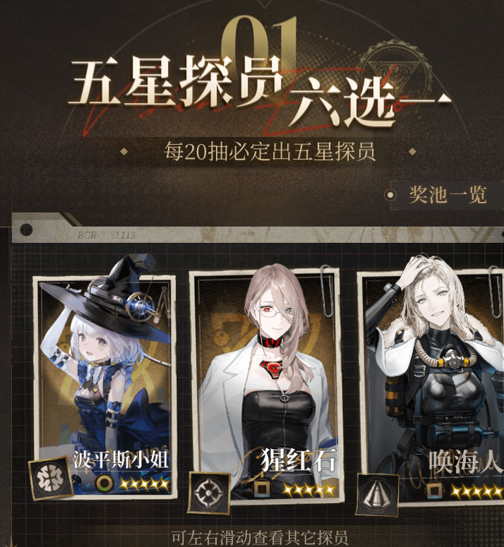 抽卡机制:每完成20次抽卡,即可获得一个随机五星探员。如果在未满20抽时抽中五星探员,则重新计算必中次数。