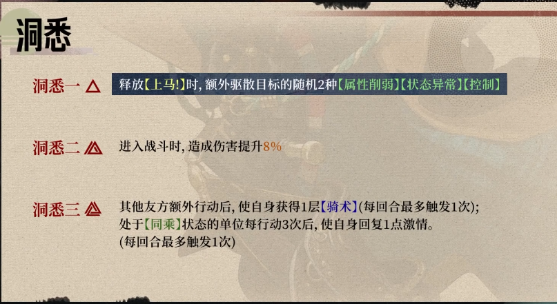 被动技能 - 戴头冲锋:施展上马!技能时,会额外驱散目标身上随机的属性削弱效果、状态异常效果与控制效果。进入战斗状态后,自身伤害得到提升;当其他友方单位完成额外行动后,宽檐帽将获得骑术效果。处于同乘状态的单位每行动特定次数,自身的激情值便会增加。