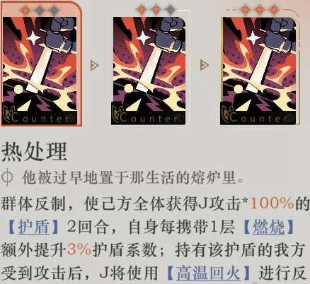 配队思路:鉴于J的特性,推荐搭配可提升敌方攻击倾向或增加怪物数量的角色,从而让J的反击与燃烧效果得到更充分的施展。