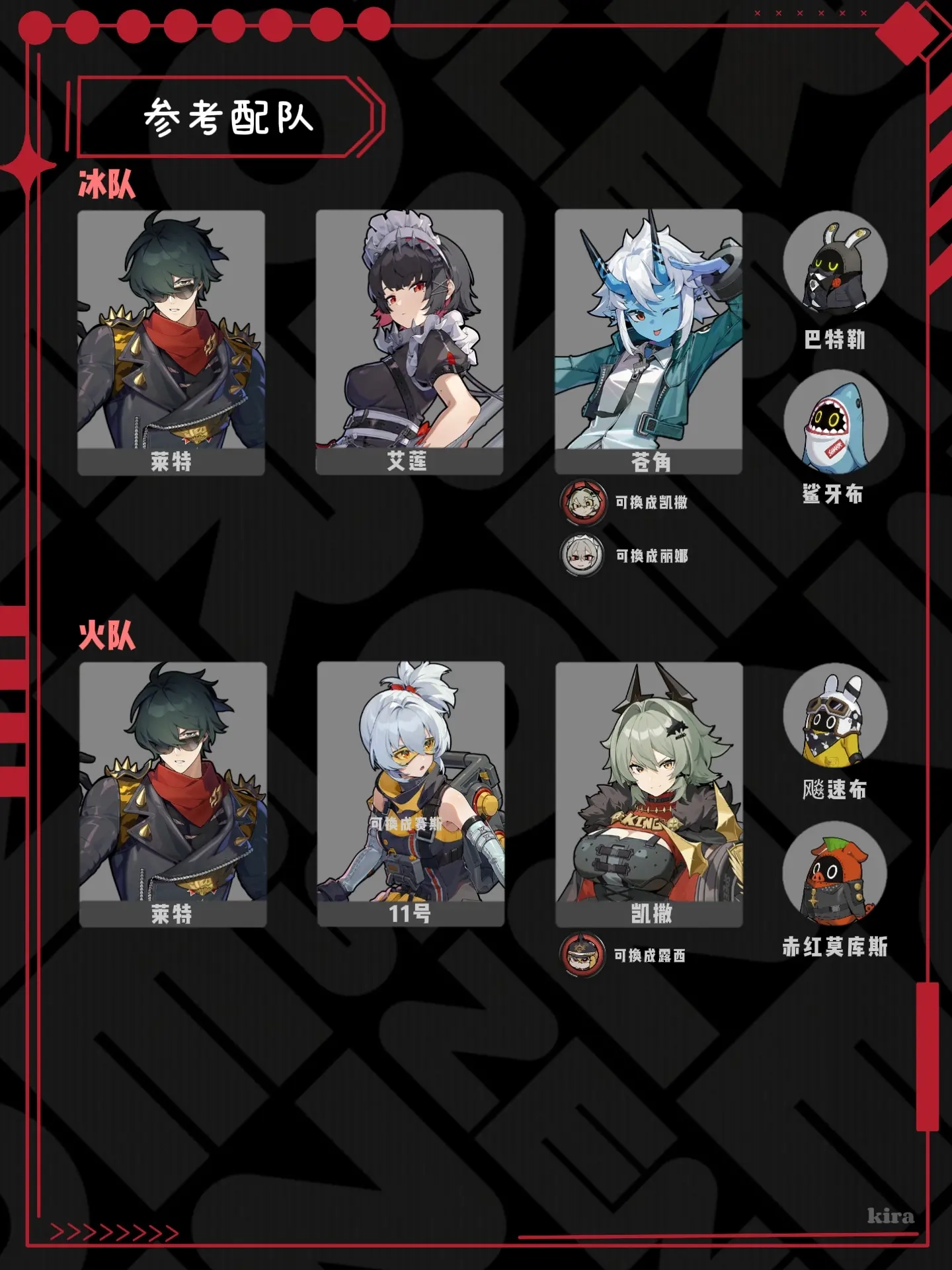 队伍搭配方面,莱特比较适合和冰属性或者火属性的队友组合,像艾莲、苍角(也可以是凯撒、丽娜)、11号、凯撒(或者露西)这类角色都可以。