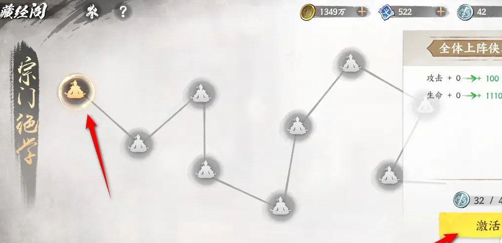 在藏经阁里,你能浏览到各大门派的独门绝学。挑中想要修习的绝学后,点击“激活”按键,就能把它收入你的武学收藏中了。