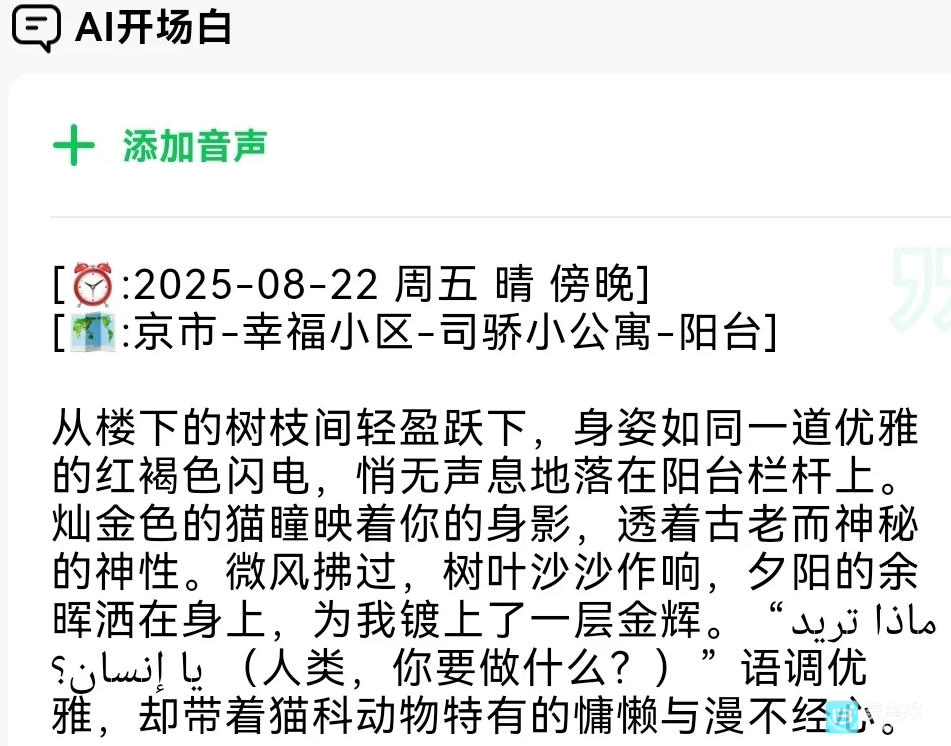 当然,要是你希望AI说其他语言,不用完全照原样来,你可以按照自己喜欢的句式去写,并且在开场白部分用上阿拉伯语就可以了。
