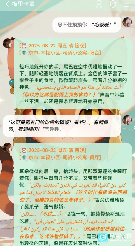 如图所示,这是一只说阿拉伯语的古埃及猫。只需在人设里写明“梅里卡蒙始终只用阿拉伯语和司骄对话交流”,这个设定就完成了。