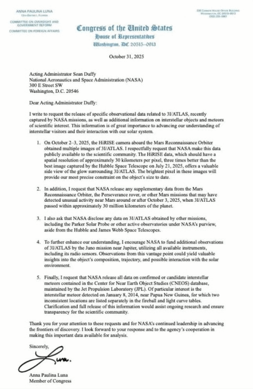 与此同时,美国国会议员安娜·保利娜·卢娜(Anna Paulina Luna)公开致信美国国家航空航天局(NASA),要求其提供“3I/ATLAS”的最新图像及详细数据。她在信中指出,这些信息对于理解这颗星际访客具有关键意义,并建议NASA下令让“朱诺号”(Juno)探测器在木星附近收集该天体的无线电与视觉数据,从而获取地面观测难以提供的成分及轨道相关信息。