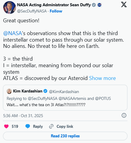 NASA代理局长肖恩·达菲(Sean Duffy)在X平台发文称:“这是第三颗进入我们太阳系的星际彗星,不存在外星人,它对地球也没有任何威胁。”