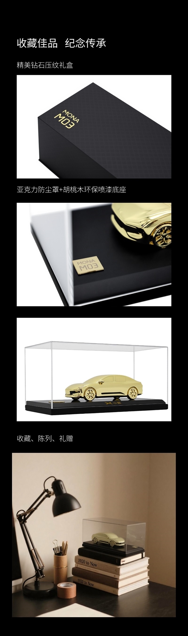 这款车模以1:43的比例精心复刻,借助流线型设计艺术,完美还原了MONA MO3的精致线条。其材质采用锌合金精密铸造,表面还经过24K真金电镀处理。