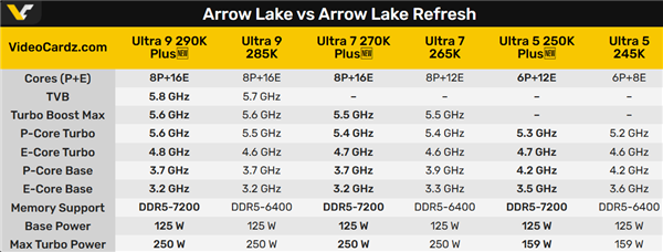 和265K相比,E核数量增加了4个,核心配置变为8P+16E共24核心,这一点与285K一致,不过频率参数没有任何变化。