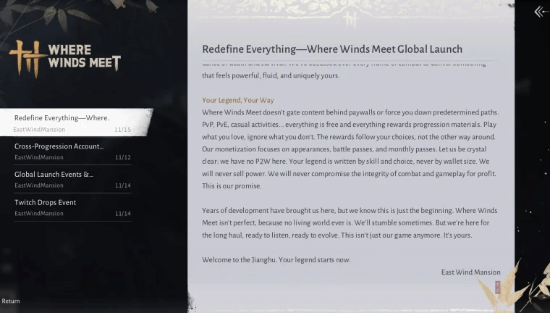 《燕云十六声》不会把内容限制在付费墙内,也不会强制玩家遵循预设的路线。无论是PvP、PvE还是休闲活动……所有内容都对玩家免费开放,而且参与任何内容都能获得提升所需的材料。玩家可以自由选择喜欢的玩法,不必在意其他内容。奖励会根据玩家的选择来发放,而非反过来约束玩家的选择。游戏的盈利点将聚焦于外观道具、战斗通行证和月度通行证。在此明确声明:我们的游戏不存在“付费即赢”(P2W)机制。