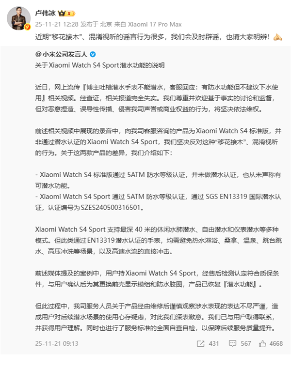 这段录音实际询问的是Xiaomi Watch S4标准版产品,而非具备潜水认证的Xiaomi Watch S4 Sport款;前者本身未进行潜水认证,也从未宣称拥有可潜水功能。