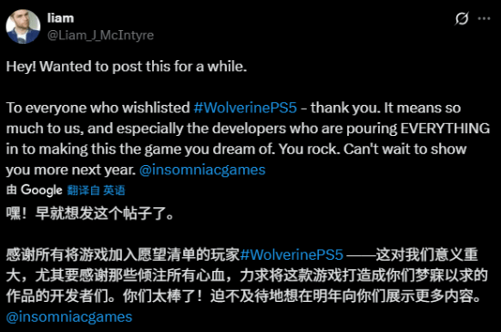 今日,《漫威金刚狼》中金刚狼的饰演者Liam McIntyre在推特上发布消息,向所有把这款游戏加入愿望单的玩家表达了谢意,同时透露“已经等不及要在明年分享更多相关内容了”!