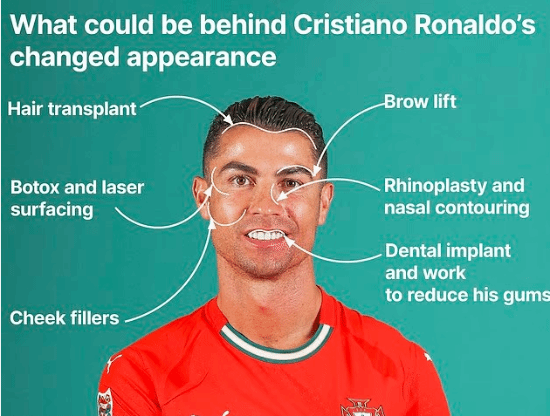 C罗的前额与脸颊:作为一名年近40岁的男性,他那光滑饱满的前额“完美得有些不自然”。莱文博士分析称,这很可能是注射肉毒杆菌消除额纹与鱼尾纹的效果。此外,他较为突出的高颧骨,或许是借助填充剂或脂肪移植等方式进行了“增容”处理,以此来应对因年龄增长导致的面部组织流失问题。