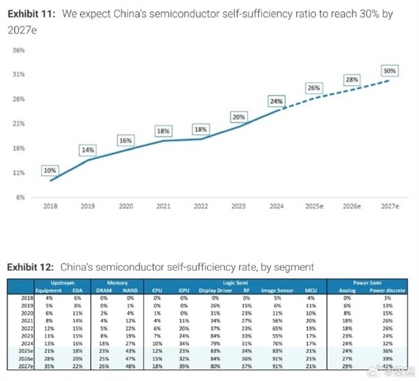 根据摩根士丹利发布的报告预测,到2027年,国产内存芯片的自给率有望达到26%,闪存芯片的自给率则将提升至48%——这意味着最快大约两年后,存储芯片领域的市场格局就将迎来重大转变。