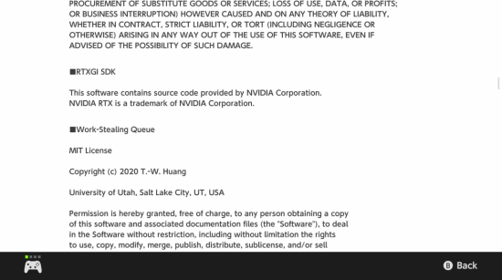 从截图内容来看,Switch 2的系统菜单里,《星之卡比:天空骑士》的许可证说明部分明确标注,该游戏采用了NVIDIA的光线追踪SDK,并且特意说明其支持光线追踪全局光照技术(Ray Traced Global Illumination,即RTXGI)。
