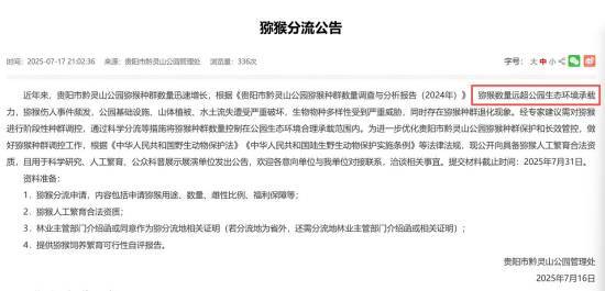 潇湘晨报记者留意到,贵阳市云岩区人民政府官网曾于7月发布一则猕猴分流公告。公告提及,近年来黔灵山公园的猕猴种群数量增长较快,依据《贵阳市黔灵山公园猕猴种群数量调查与分析报告(2024年)》,当前猕猴数量已超出公园生态环境的承载能力,不仅猕猴伤人事件时有发生,公园的基础设施、山体植被也受到严重破坏,水土流失问题加剧,生物物种多样性面临威胁,且猕猴种群还出现了退化迹象。经专家研究建议,需对猕猴种群实施阶段性调控,通过科学分流等方式,将其数量控制在公园生态环境可承受的合理范围内。