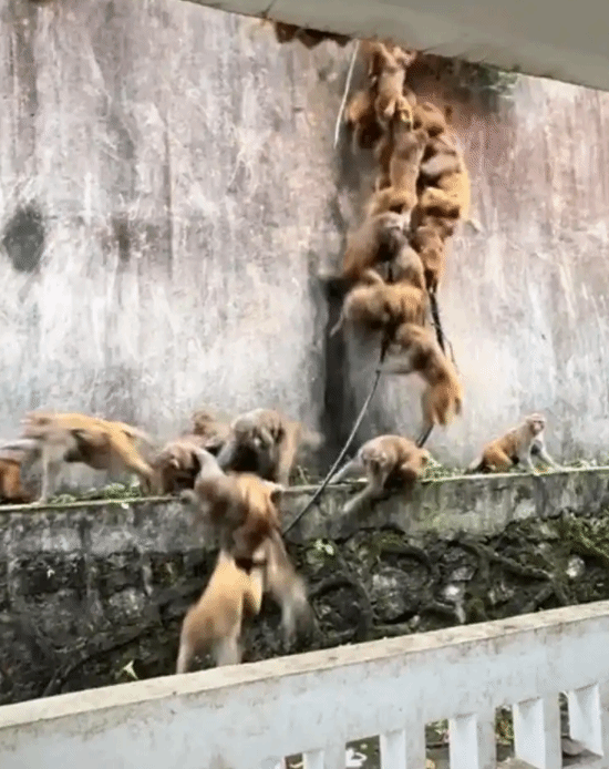 现场画面里,数十只甚至上百只猴子从山上狂奔而下,有的沿着线缆滑行,随后又成群结队地翻过护栏,朝着山下冲去,动作十分敏捷。
