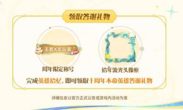 完成英雄拾忆活动后,玩家将收到《王者荣耀》准备的答谢福利,其中包含全新的【周年限定称号+拾年流光头像框】。称号领取后,玩家需到背包里进行使用,还能分享自己的本命英雄。