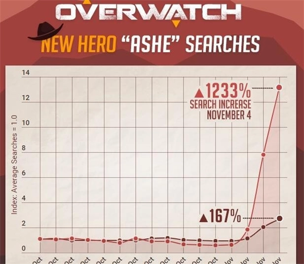 在近期的暴雪嘉年华上,《守望先锋》推出了新英雄艾什,这位角色以西部枪手为造型,是一名女性英雄。这样的人物设定赢得了不少玩家的喜爱,这一点从国外“车”站的搜索数据中便能看出。