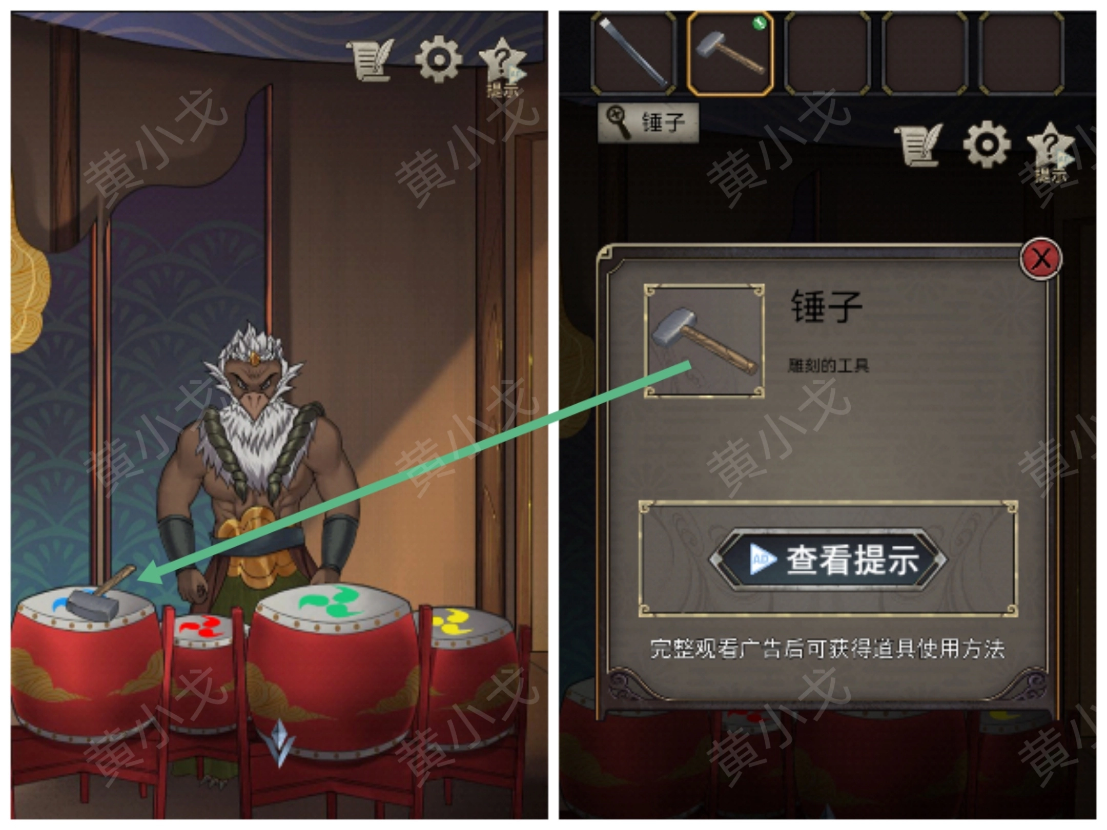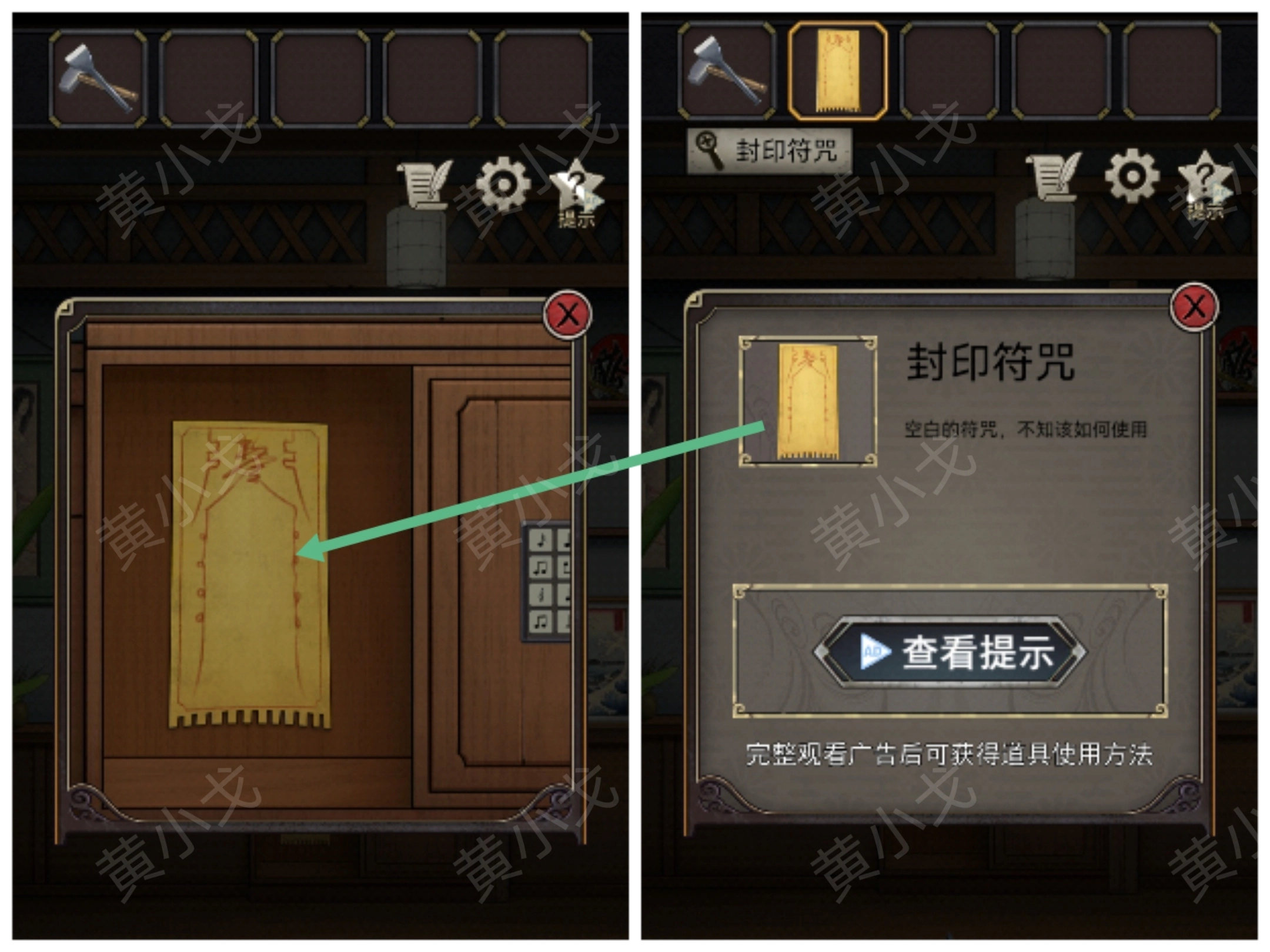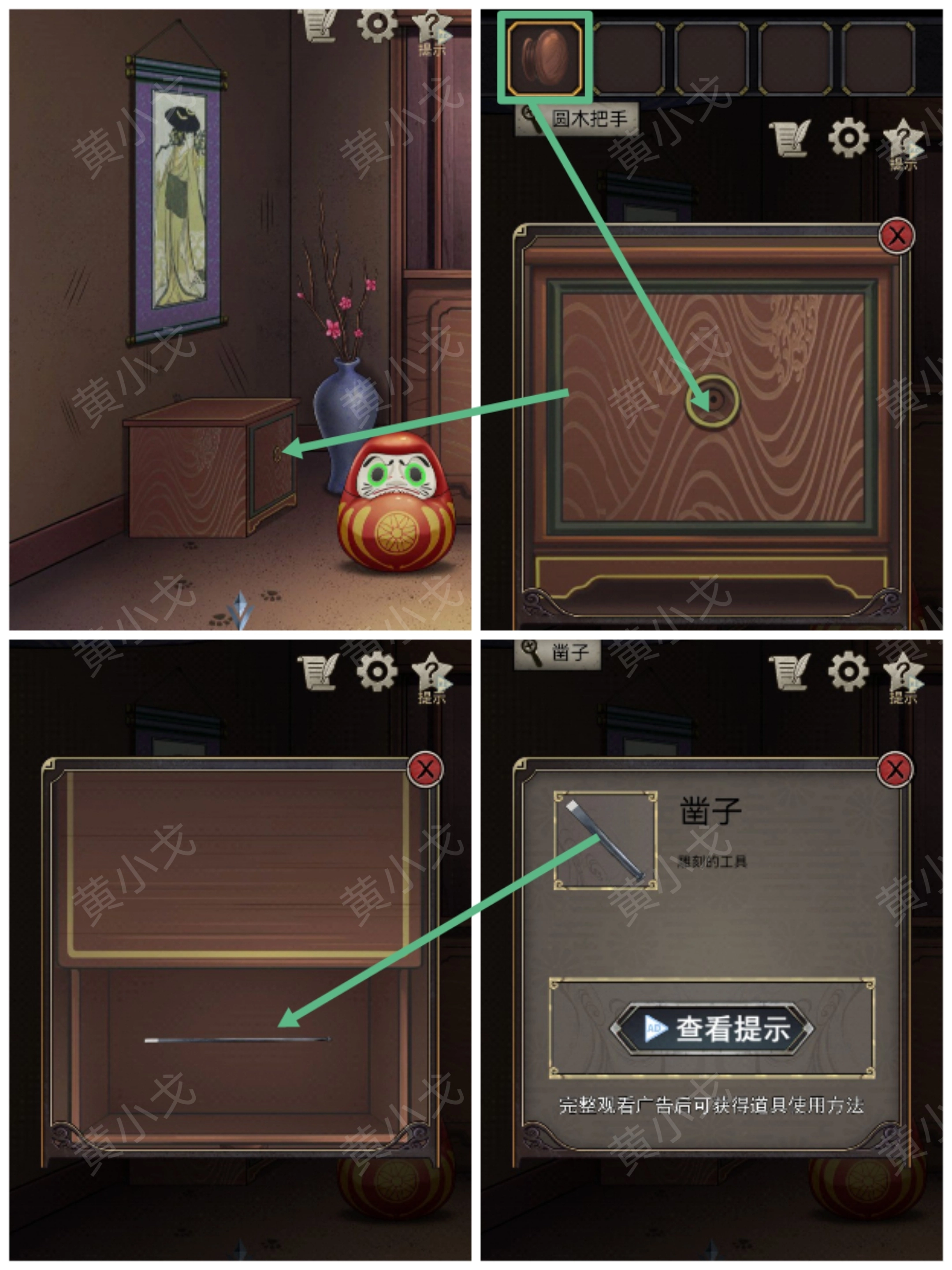 1.(当铺一楼)点击矮柜,装上【圆木把手】;打开矮柜,获得【凿子】