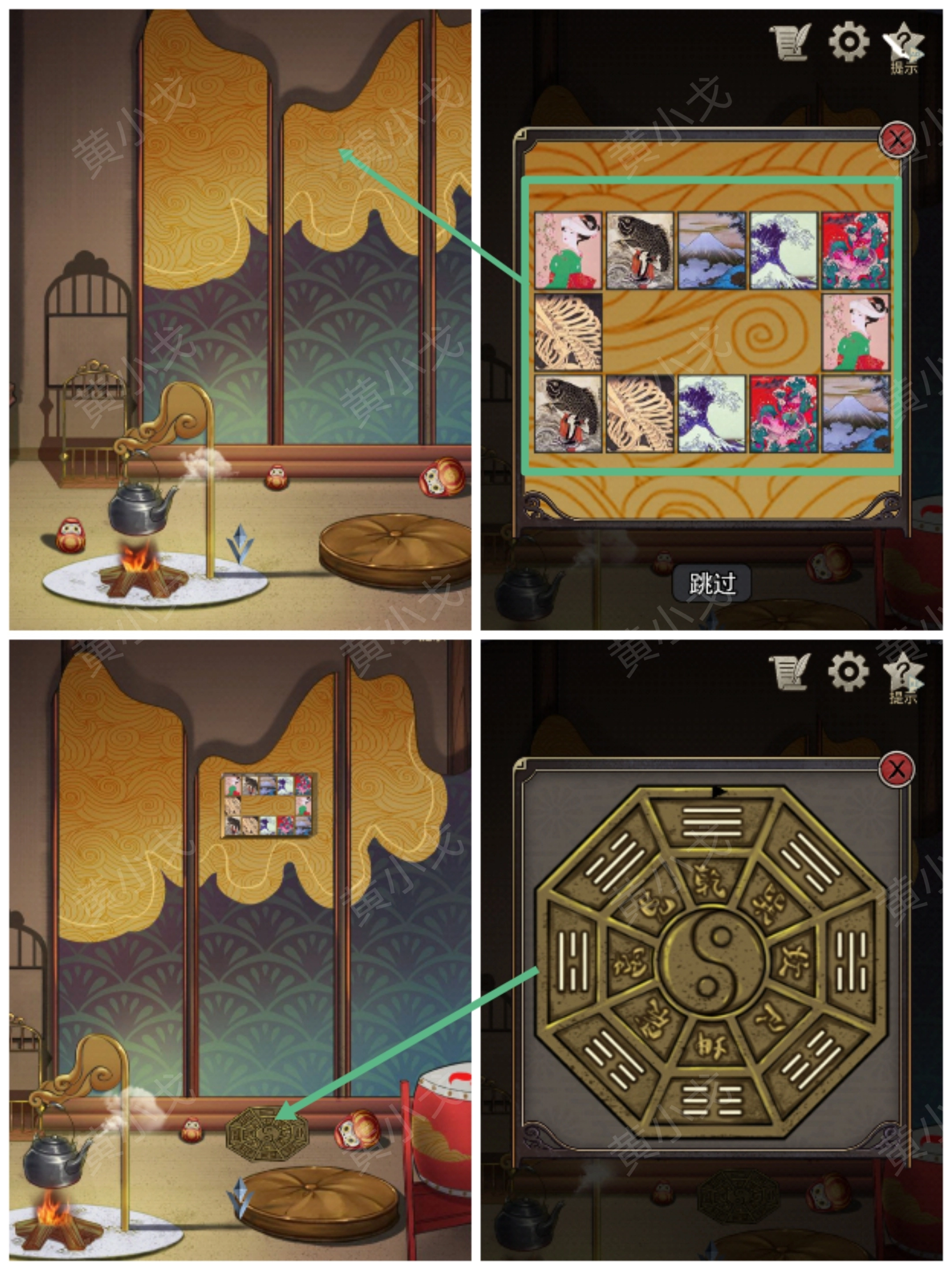3. 于当铺二楼,点击屏风上的格子,完成翻牌小游戏,随后点击查看掉落的八卦盘。