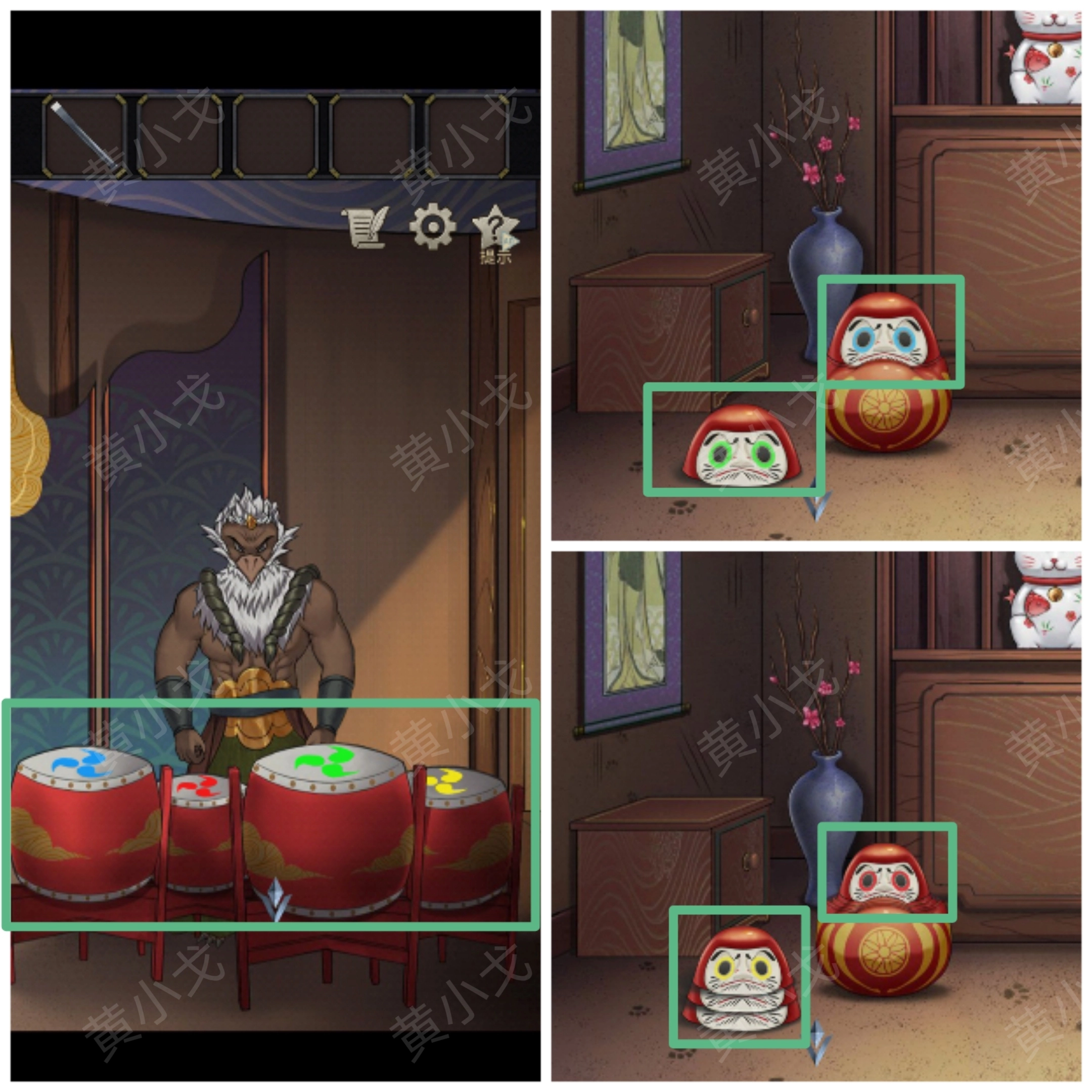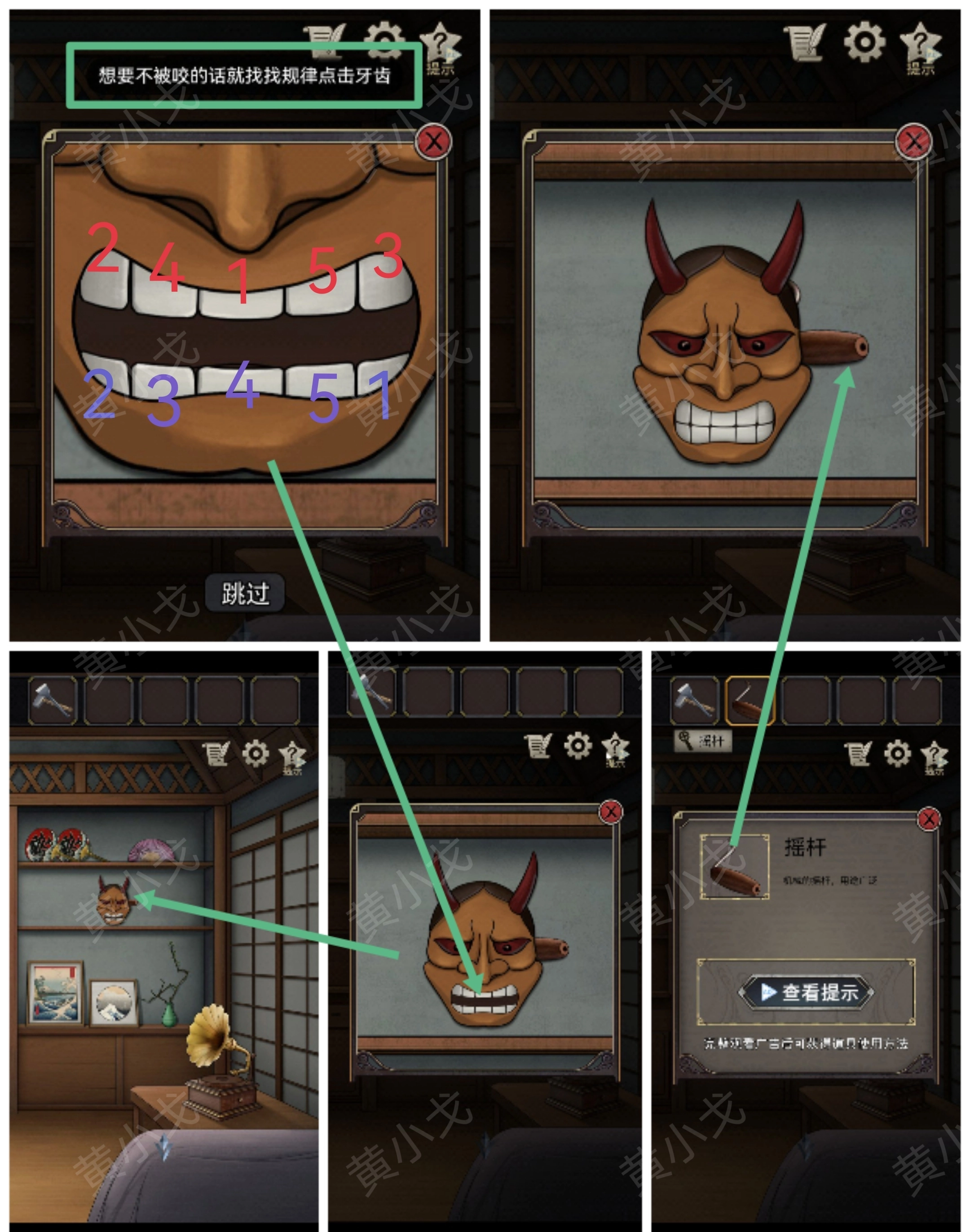 13. 在妖怪屋二楼,点击架子上的面具,接着点击面具的牙齿。按照特定规律点击牙齿,上面那排按31524的顺序,下面那排按51234的顺序。完成操作后,即可获取【摇杆】 。
