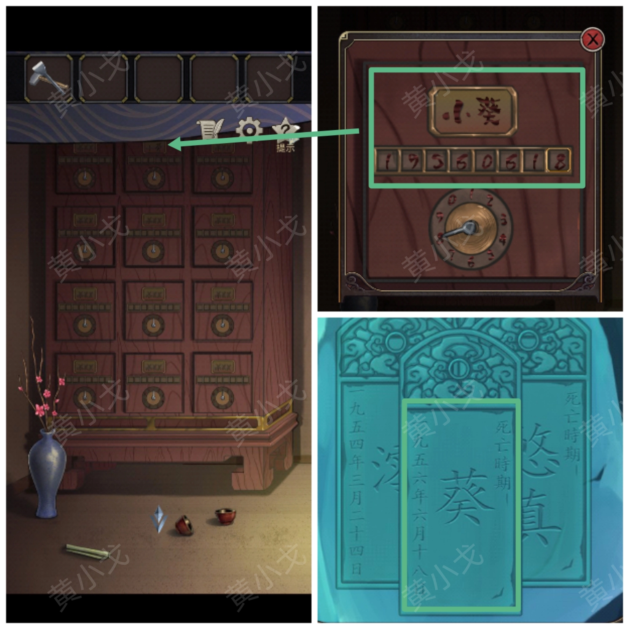 8.(当铺二楼)点击寄存柜中小葵的柜子,依据生死牌上的线索,输入密码:19560618