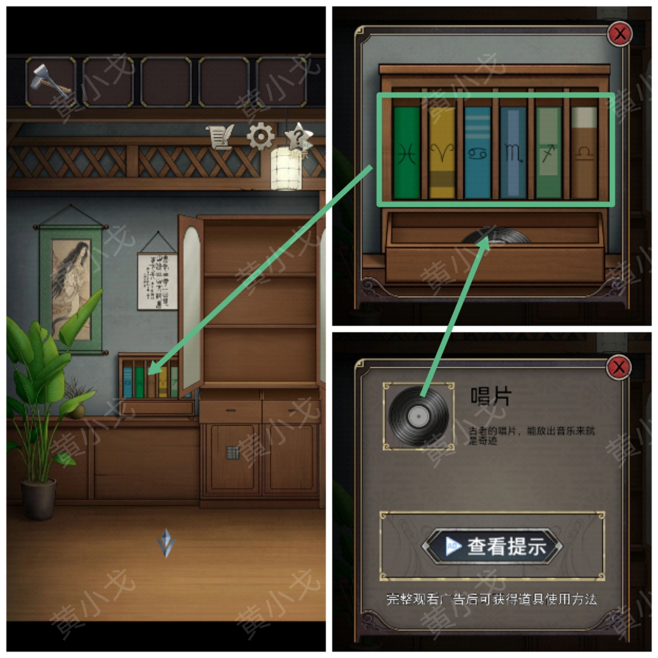 14. 轻点书柜,把书放回对应的位置(柜子上标有对应的符号);拉开抽屉,获取【唱片】