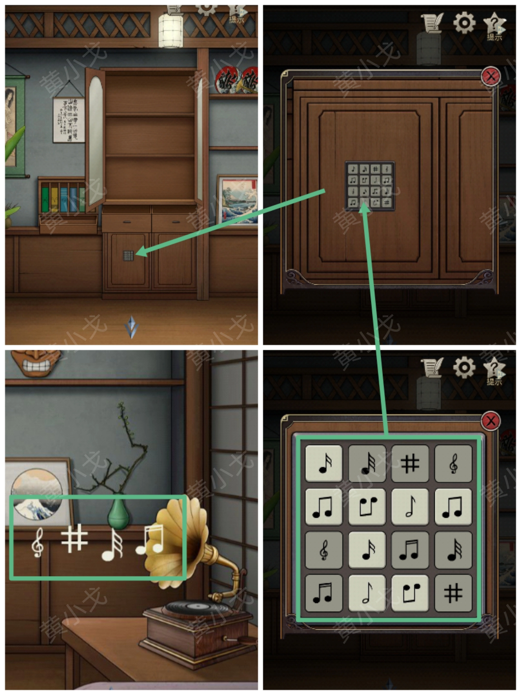 16. 轻触柜门上的密码锁,依据唱片机所播放的音符线索,按下与之对应的多个音符按钮。