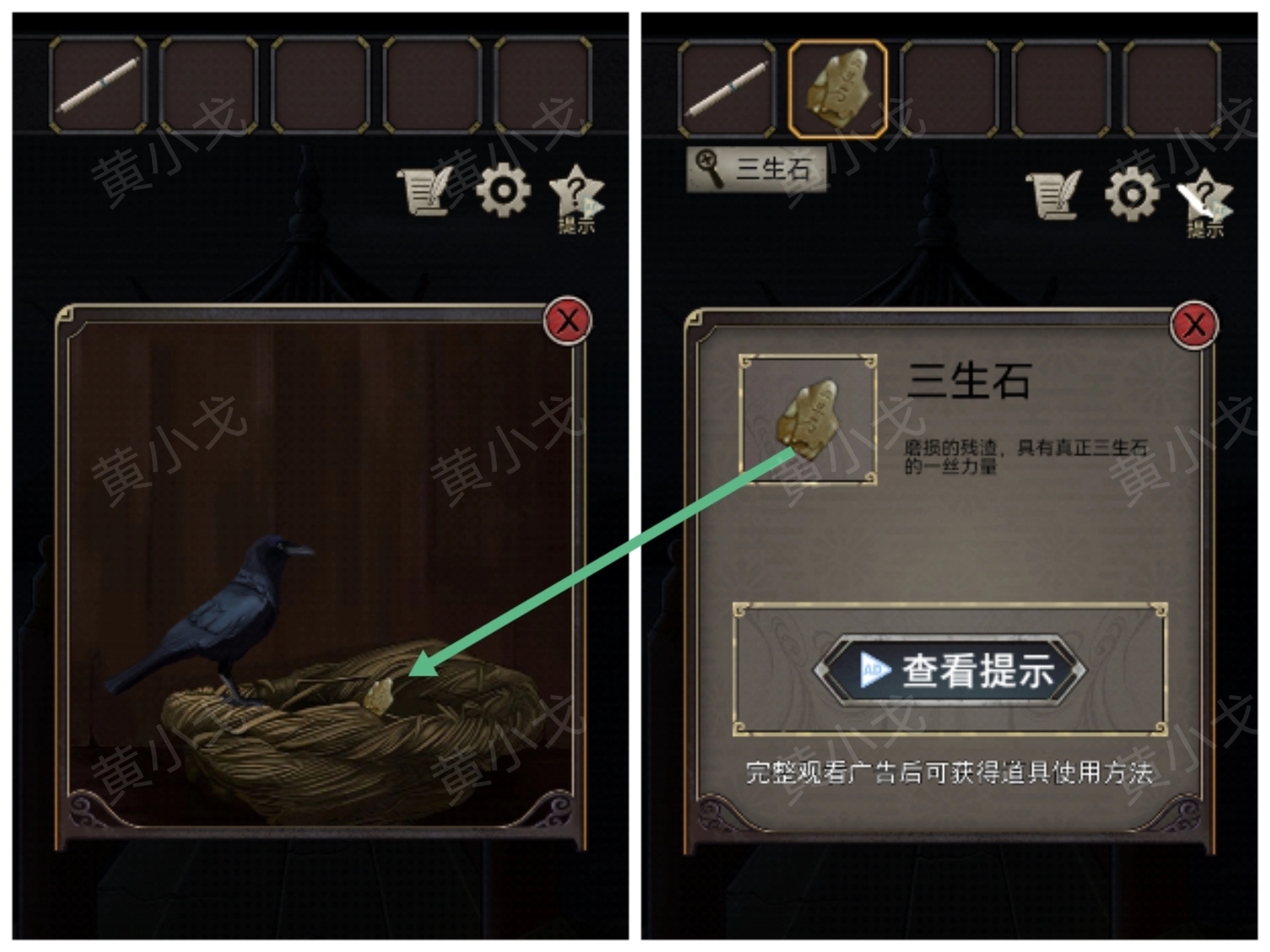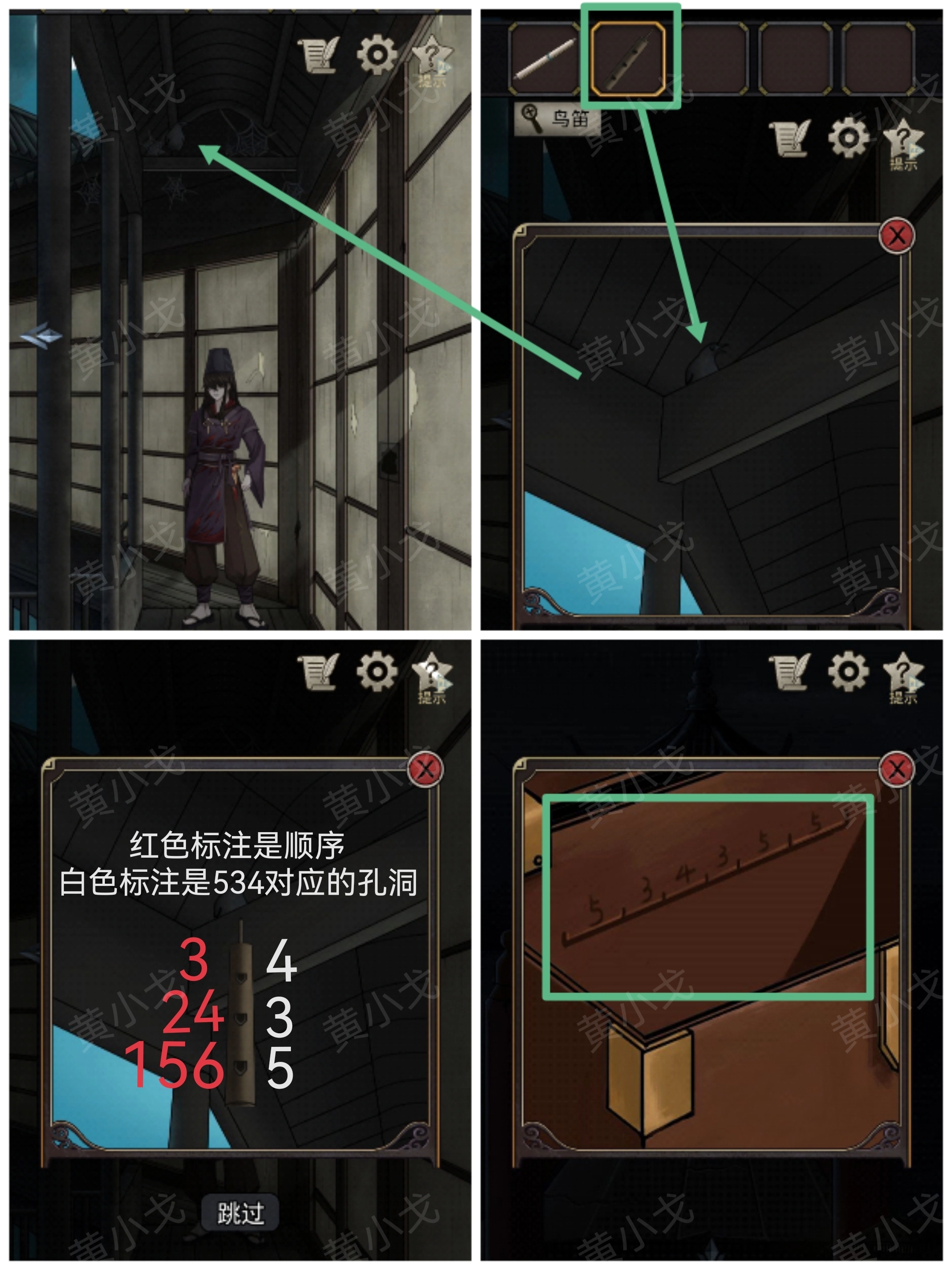 6.(游廊)点击房梁上的乌鸦,使用【鸟笛】;根据盒壁上的刻痕,按顺序吹笛,乌鸦飞回窝