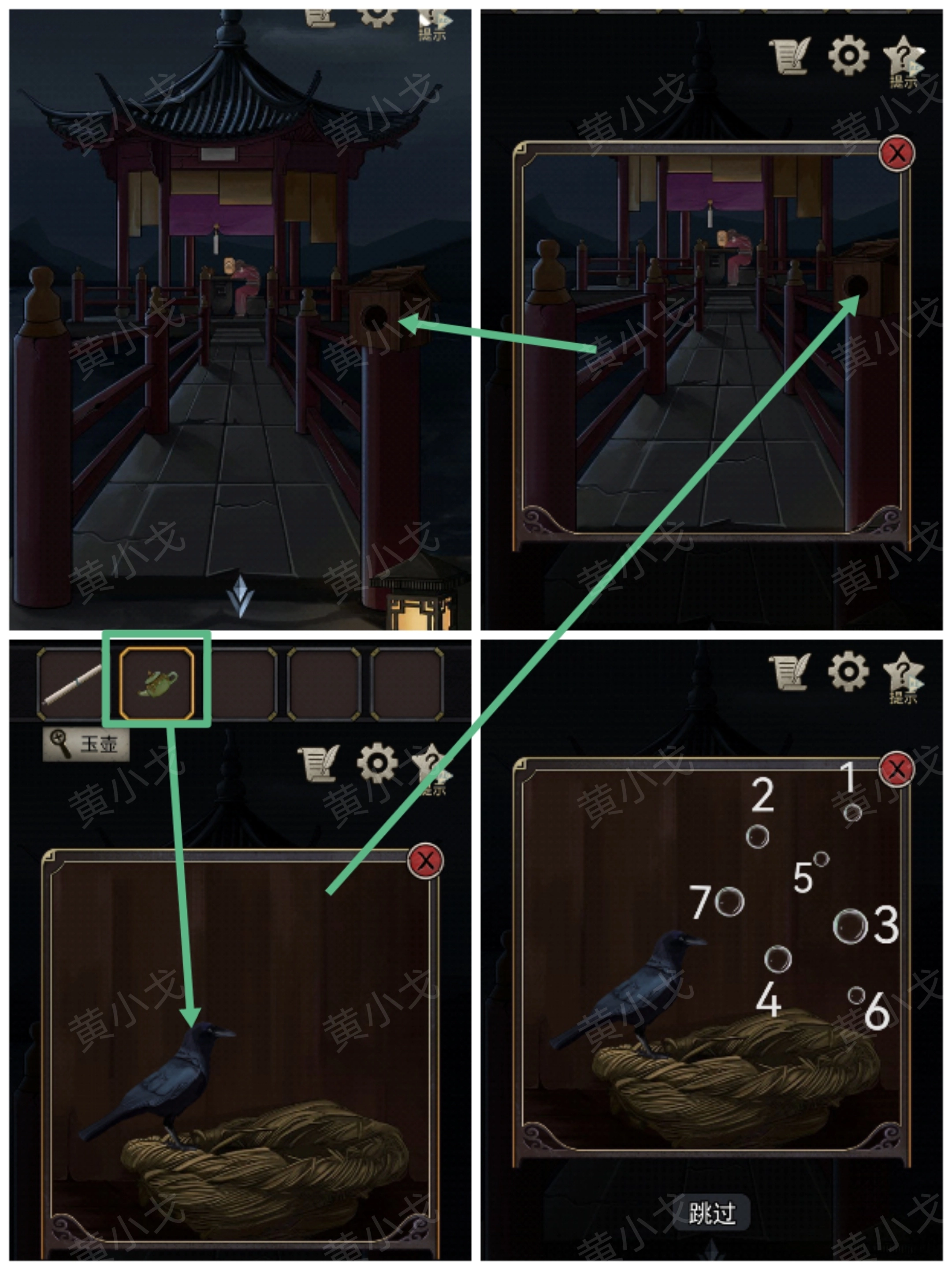7.(亭子)点击鸟窝,使用【玉壶】,完成小游戏(按顺序点击泡泡,无规律,自己摸索)