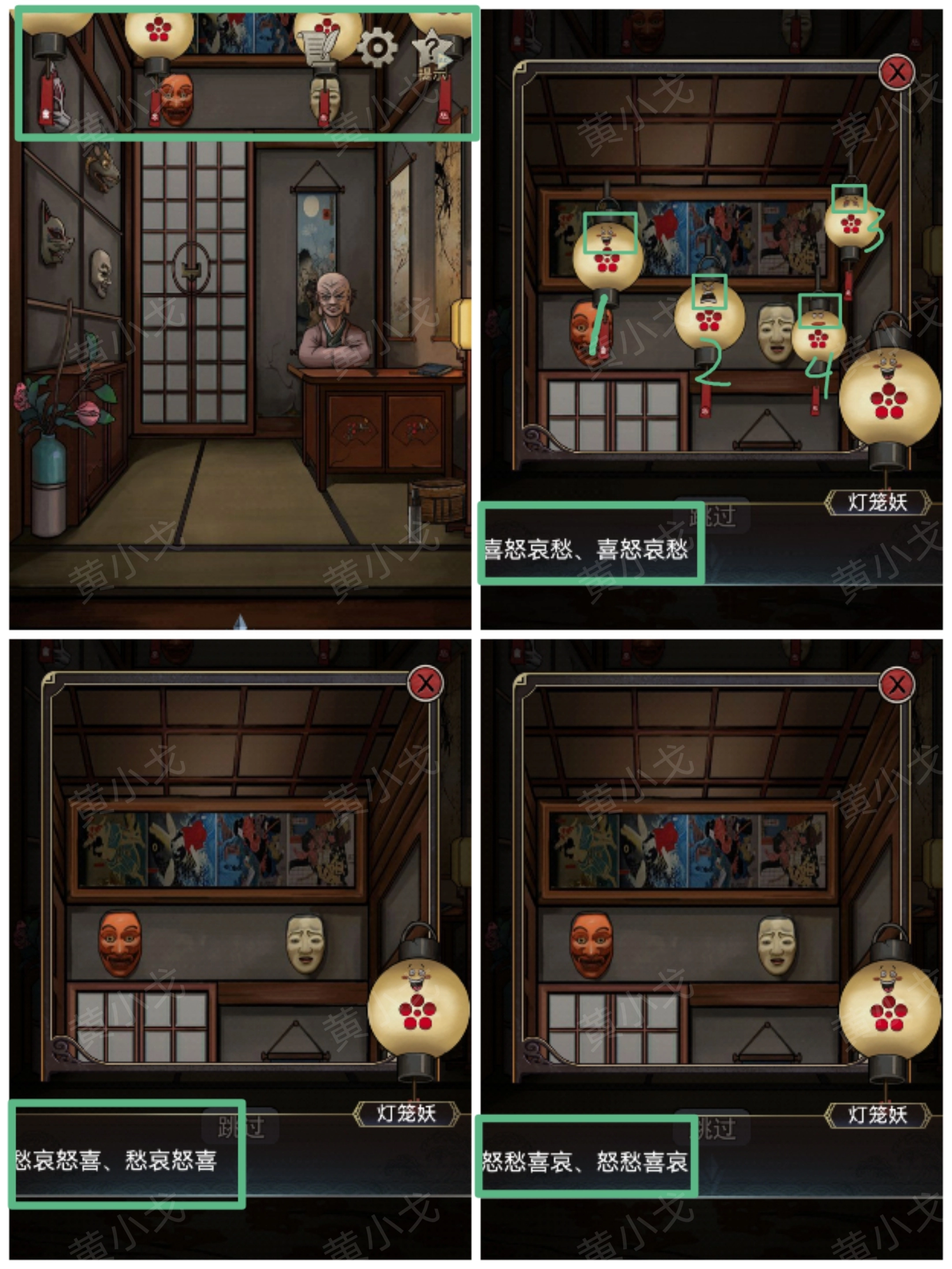 15. 轻点灯笼妖,接着依据提示,按照“喜怒哀愁、愁哀怒喜、怒愁喜哀”的顺序,依次点击对应表情的灯笼。完成操作后,即可触发机关,进而获取【钥匙】 。
